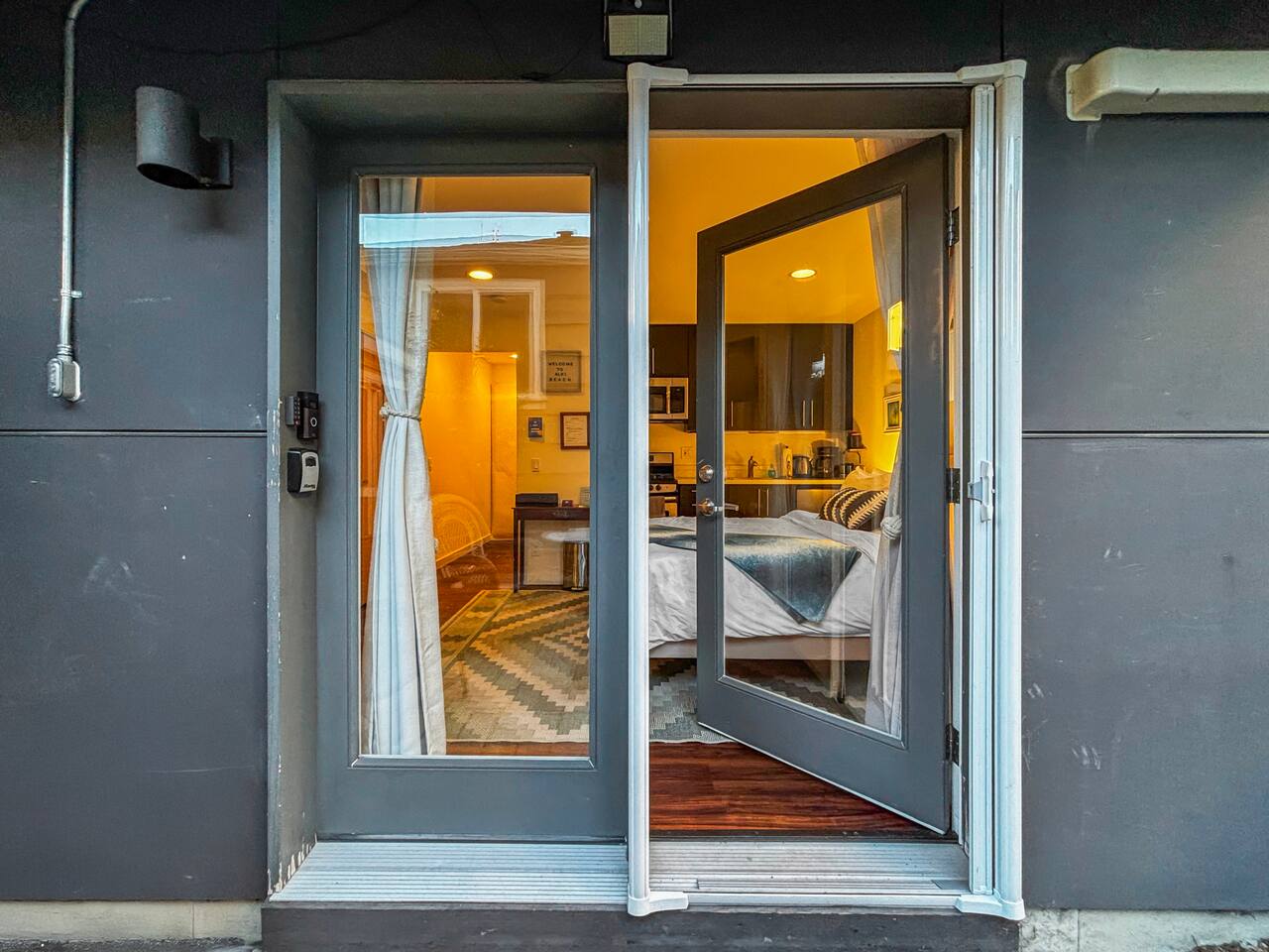 Electronic lock with keypad allows 24-hour access, with an additional combination lockbox with key as backup.