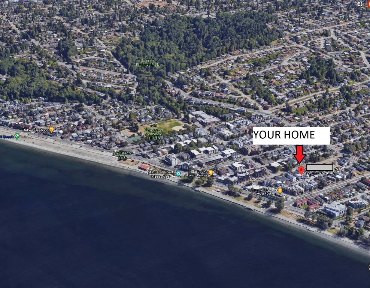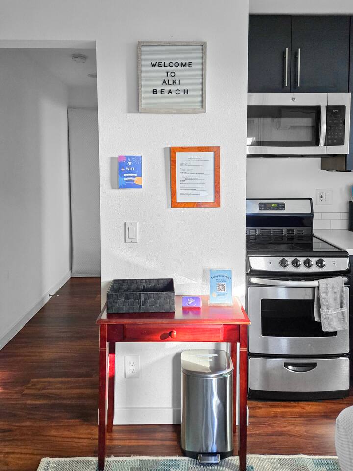200 steps to Alki Beach + Restaurants! - Private Patio, AC, Fast WiFi, Smart TV - Brand new Queen Bed - Full Bath w/Tub + Shower - Compact Kitchen (full stove/oven) - Amazing sunsets, dining ½ block away! Plus, easy Downtown access via Water Taxi + Free Shuttle! Note: We recently refurbished this unit with new flooring + Queen Bed with comfy Green Tea mattress! Ask us for recommendations in the area! We're local. Professionally managed by Host Jeeves.
