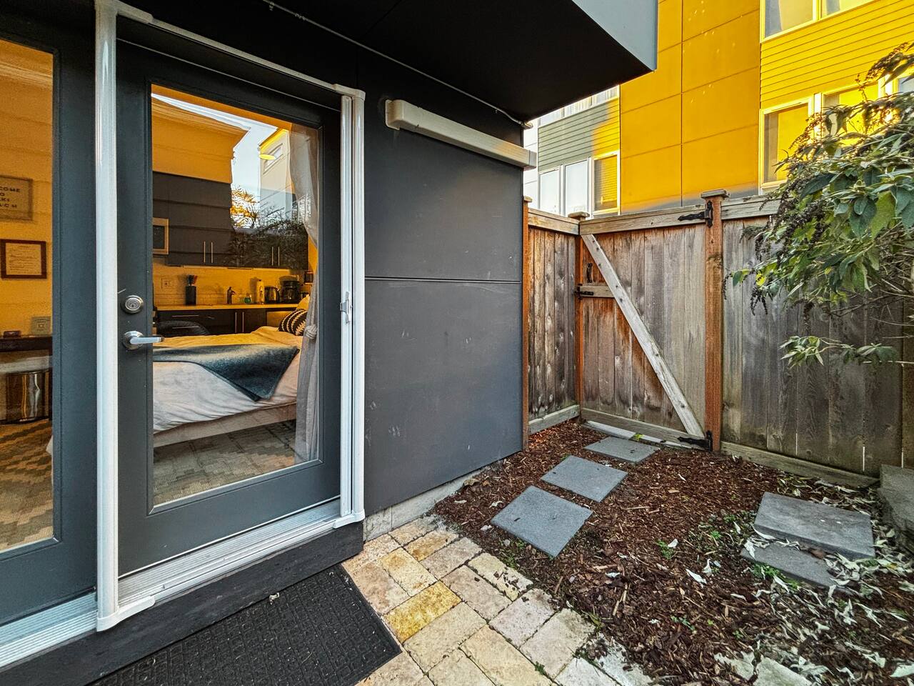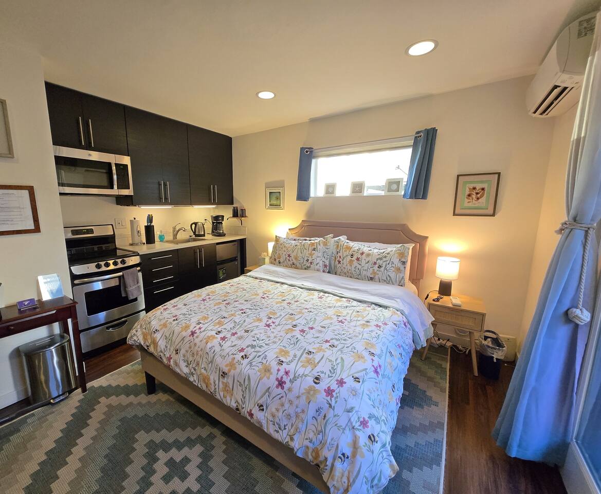 **01/25: We've heard your suggestions and have given the studio a brand new MAKEOVER! Comfort is our first priority, so we've ditched the sleeper sofa bed for a proper Queen with a high quality, super comfy mattress. (The bed is cuter too!) We've torn up the old carpet and replaced with ALL NEW wood panel flooring. Your experience matters most to us - we hope you enjoy! -- This studio is perfectly located and though it is very compact, has all you need to enjoy the many restaurants & beach activities a mere ½ block away. ESPECIALLY with the newly installed built in Air conditioning and Heating inverter. Tucked away off the street with its own gated private patio entrance, this compact studio is SMALL but COMPLETE with a Queen size bed with a Green Tea mattress, plus FULL BATH and mini-kitchen with a real stove and oven. The studio is 200 steps from the beach, on the ground floor of a modern architect-designed townhome, completely separated from the upstairs living space (also available to rent) by a double-keyed deadbolt door. This apartment is perfect for one person or a couple who want to explore Seattle and all it has to offer, or just chill at the beach. The unit is very private, but please note there is a separate unit upstairs so you can sometimes hear activity from the people above. If that would bother you, this might not be your ideal spot. There is no dedicated parking but street parking is free. -- KITCHEN - Electric oven with 4-burner glass-top stove/range - Drip coffee maker w/beans + grinder provided - Electric kettle, tea & sugar - Mini Fridge + Freezer - Microwave, Toaster, Toaster Oven - Pots and pans, drinking glasses, dishware, utensils DINING - Fold out leaf table with seating for 2-3 - Outdoor patio seating for 2 LIVING AREA - Leaf table doubles as a compact workspace - Full Closet w/ hangers, luggage rack, iron, ironing board, clothes rack, vacuum, first aid kit - Samsung Smart TV with adjustable mount - Entry console/welcome table with brochures & magazines of local sights and activities - Coat Rack BED AREA - Mitsubishi Mini-Split AC Inverter (remote controlled) - Queen Bed with brand new mattress - Bedside tables w/ lamps and charging cables BATHROOM - Spacious bathroom with full bath + shower - Towels provided, as well as basic toiletries (e.g. toothbrushes) - Shampoo, Body Wash, Conditioner - Well-stocked with supplies and extras!
