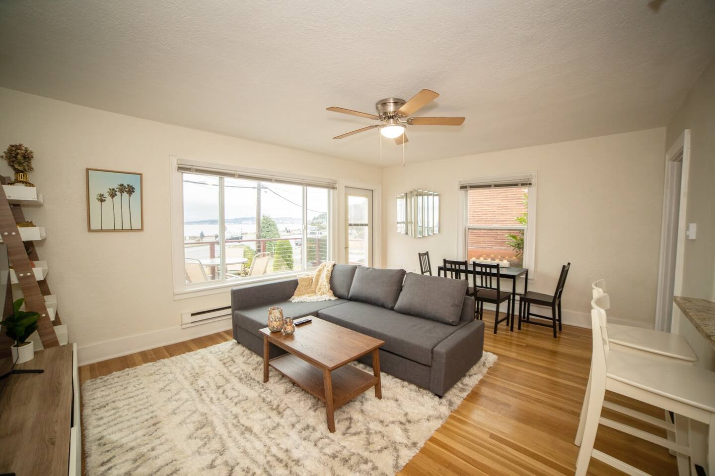 This private 1bd unit sleeps 4 and is in a corner triplex across the street from Alki Beach Park. Its view of Puget Sound faces Bainbridge Island and features the most amazing sunsets. Rental bikes and scooters are just steps from your door. Please note that this unit only has one bedroom with a queen bed, so to accommodate 4 people, it would involve using the sofa bed in the living room. You have your own private space with full kitchen, private bedroom, and deck to relax or engage in the many beach activities. Features: ~Its own Lounge Deck overlooking the water ~Fast Wi-Fi ~Full kitchen ~55" Samsung 4K TV to stream your subscription channels ~Wood floors ~New furniture ~Queen bed in the bedroom ~Queen Sleeper Sofa in the living room ~One dedicated off-street parking spot ~Washer/Dryer (shared) ~Backyard area (shared)