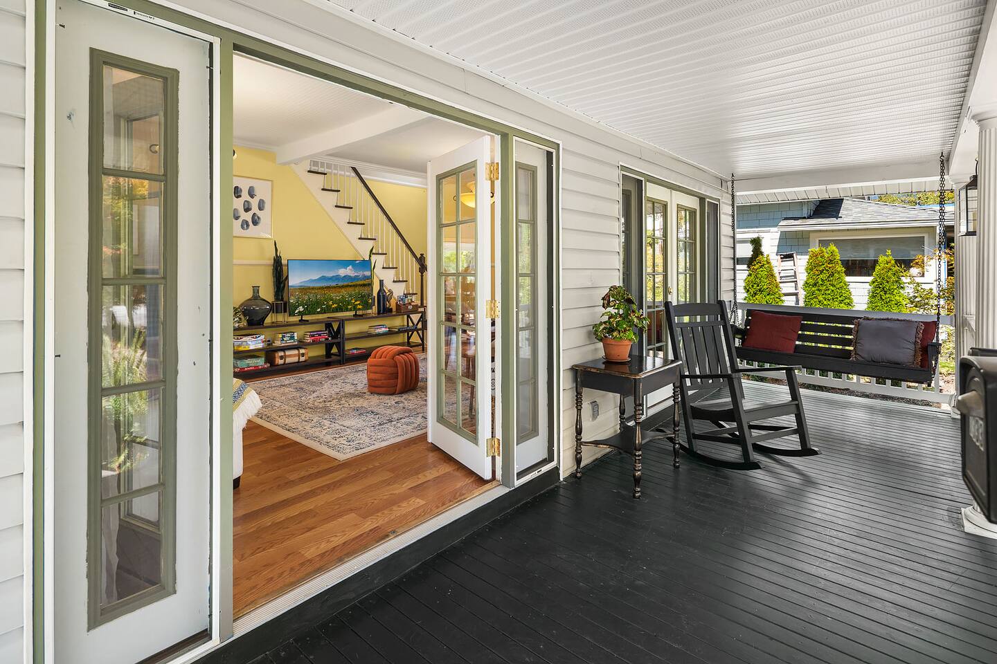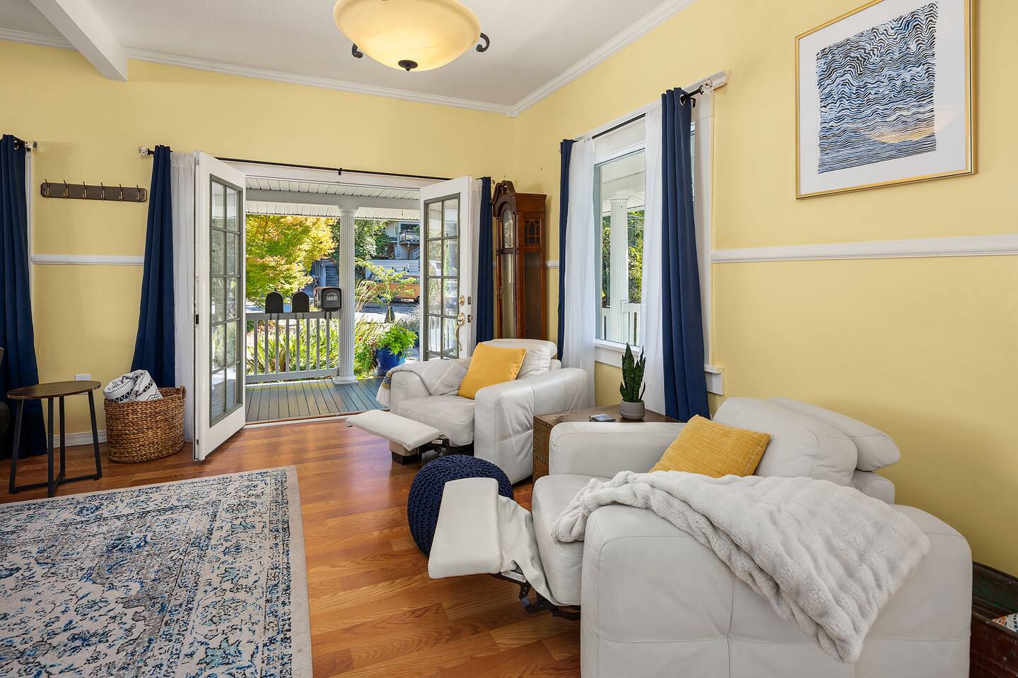 The home is yours! It was originally separated into a duplex, but you have full access to the large, primary upper unit including the front yard, private decks and driveway parking. Enter through the front door, which is on the porch. Your access is secured by an electronic lock with a smart keypad on the front door. Simply enter your unique code, and you're in! Once inside, you can also enter and exit through the French doors on the front porch that go to the living room. For safety, please keep these doors locked at all times except for when you are actively using them to go in and out, or are actively using the front porch.