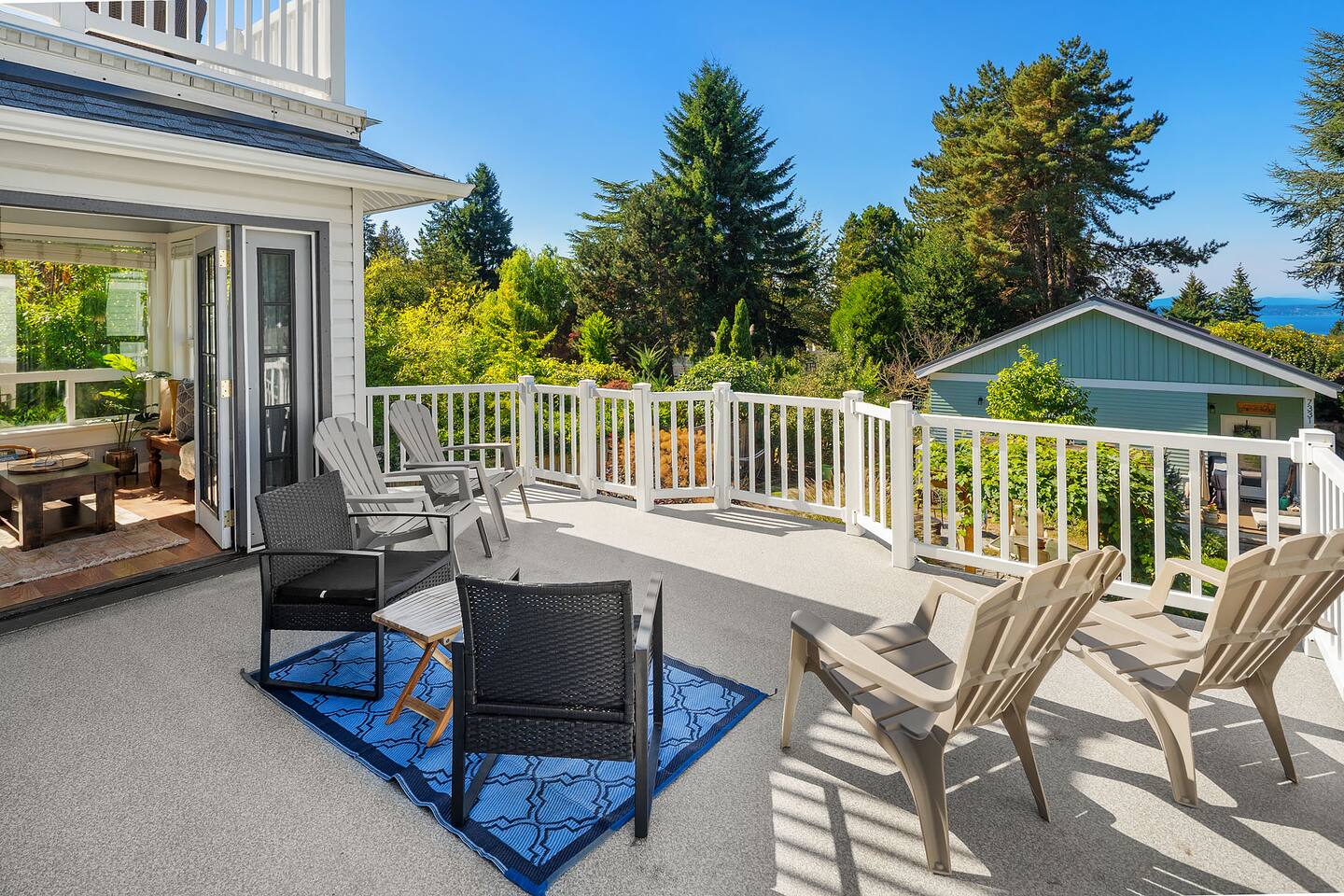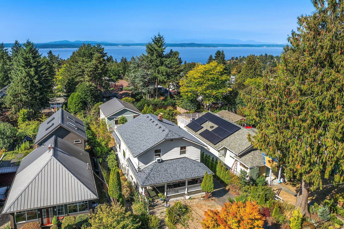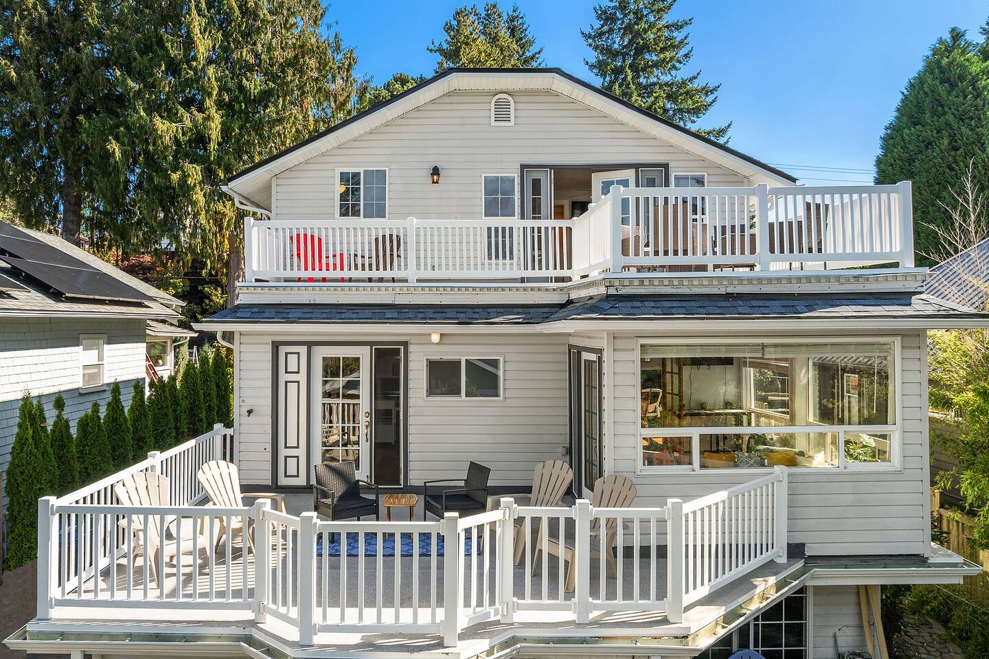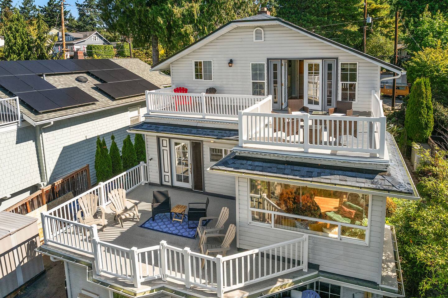 Find peace and quiet at our spacious, sun-filled home in West Seattle! Private and residentially located but walkable to cafes, parks & restaurants, you are close to California Ave and have easy access to downtown West Seattle and the Fauntleroy Ferry. Perfect for families or a group of friends, you have a large front porch and yard, spacious living room, chef's kitchen, dedicated workspaces, private decks with gorgeous views, flex room (sunroom that converts to 4th bedroom), and driveway parking. We hope you love our charming Craftsman! Featured Amenities: - Quiet, safe, and private residential neighborhood - Fast WiFi - 3 min to Thriftway, 4 min to Lincoln Park, 6 min to Westwood Village - 2 decks with gorgeous view of mountains over the Puget Sound - 3 bedrooms + 1 flex room (bedroom/sunroom) - Chef's kitchen - Free parking (driveway; also free street parking) - 4 TVs in the home DECKS: - Two expansive decks overlooking a gorgeous view of the Olympic Mountains over the Puget Sound - Main Floor Deck: Access through doors in flex room and in laundry area by kitchen - Top Floor Deck: Access through doors in master bedroom - Adirondack chairs and conversation sets for seating— chat, entertain, or eat while watching the sunset KITCHEN: - 4-burner electric range stove with built in griddle; Spacious oven + extra, smaller side oven - Ample counter space makes prep easy! - Dishwasher, Full sized fridge/freezer, Microwave - Trash compactor - Blender, 4-slice Toaster, Rice cooker, 2-Basket XL Air Fryer - Drip Coffee, Keurig, French Press, Burr Mill Coffee Grinder (coffee/beans provided), Tea, Sugar, Creamer - Ceiling-mounted pot rack - Fully stocked, all cookware and dishware - Cooking necessities (oil, salt, pepper; miscellaneous herbs, spices, sauces and seasonings) - Next to laundry area and main floor deck DINING ROOM: - Antique dining table, seating for 4 - Antique drop-down secretary/writing desk - Sit-stand desk with chair LIVING ROOM: - Plenty of seating: White & black leather couch and love seat, white leather reclining armchairs, ottoman poufs - Large smart TV with streaming apps - Spacious room with soaring ceilings - French doors (with blackout curtains) open to generous front porch— perfect for morning coffee or entertaining SUNROOM / 4TH BEDROOM (Flex Room): - Lounge, get work done, or have a sunny bedroom all to yourself! - Filled to the brim with natural light, with plenty of windows - Connected to the main floor deck— enjoy the gorgeous view! - Portable air conditioning - Wall-mounted smart TV with streaming apps As a sunroom/office: - Enjoy plenty of seating to chat, munch, or lounge around - Large bench with coffee table, small table/desk area, 2 plush lounge chairs As a bedroom: - The double doors to the dining room lock and have blinds you can bring down for privacy. - You have your own door to the deck and to the bathroom— lock the deck & bathroom doors that connect to the kitchen, and it's all yours! - Plush lounge chairs unfold to comfy futon-style beds— laid together forms a Queen, or keep separate for two Twins. MASTER BEDROOM: - King sized bed— and the room is still spacious! - Premium mattress (Helix) and bedding - Direct access to top floor deck— only doors are in this room. Entertain with the gorgeous view, or keep it all to yourself! - Filled with natural light. - Walk-in closet with hangers, drawers, and plenty of space. - Heirloom dresser with vanity - Large wall-mounted Smart TV with streaming apps - Full-body mirror BEDROOM 2: - Queen sized bed - Premium mattress + bedding - Window AC - Closet + dressers - Wall-mounted Smart TV with streaming apps - Full-body mirror BEDROOM 3: - Queen sized bed - Premium mattress + bedding - Closet - Small seating area - Vanity + mirror BATHROOMS: Main floor bathroom: - Shower/tub combo - Bidet (toilet with attachment) - Premium linens - Lockable doors to flex room, kitchen/laundry - Fully stocked with shampoo, conditioner, body wash, and toiletries Top floor bathroom: - Shower/tub with sliding glass door, window to outdoor view from deck - Detachable shower head attachment - Spacious room with double vanity, counter space, and lots of room for linens and storage - Premium linens - Fully stocked with shampoo, conditioner, body wash, and toiletries