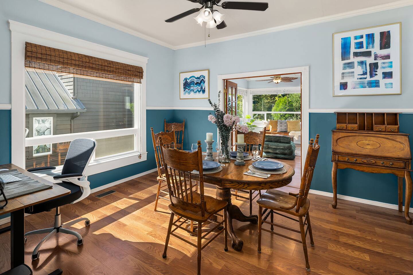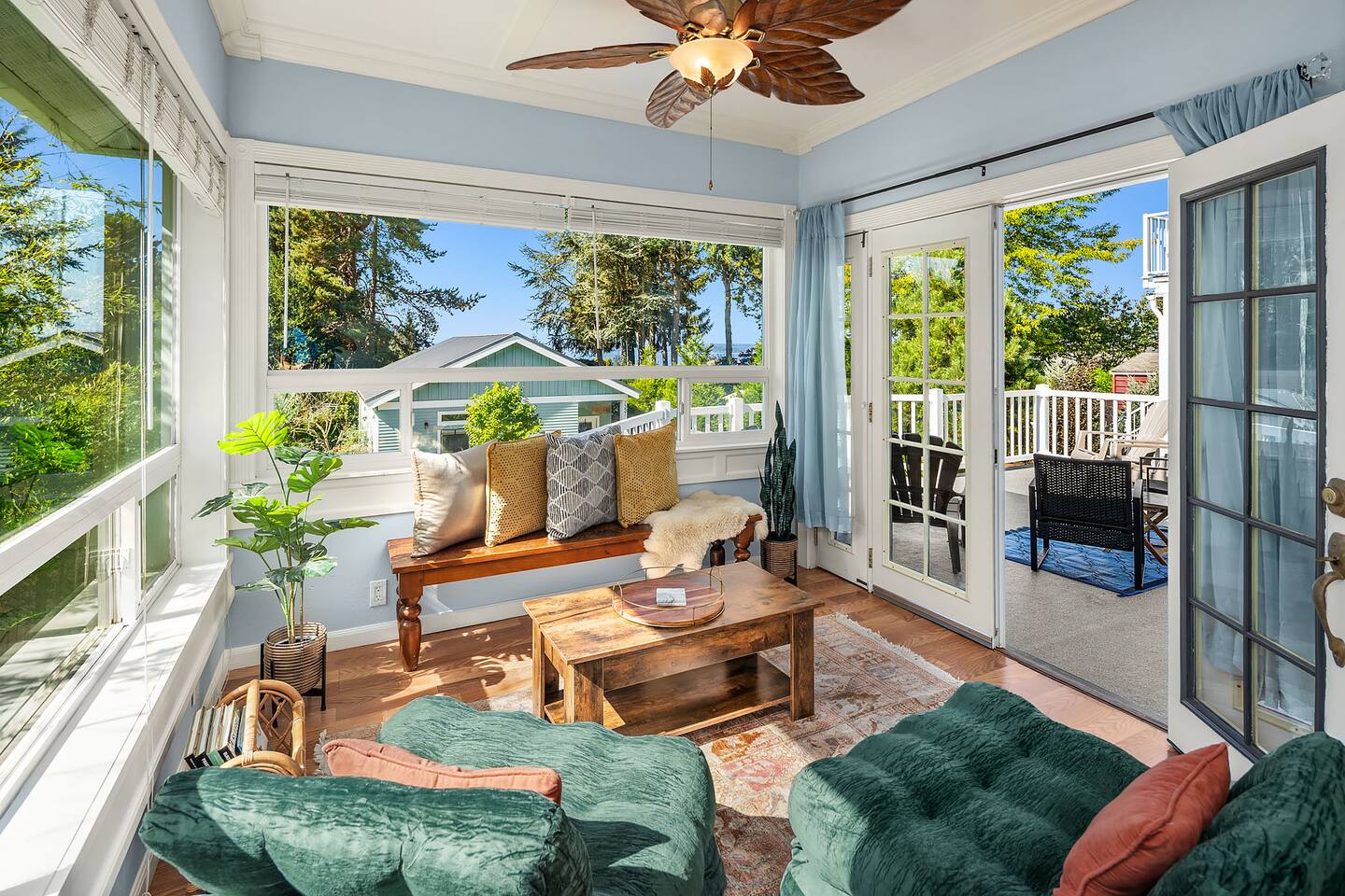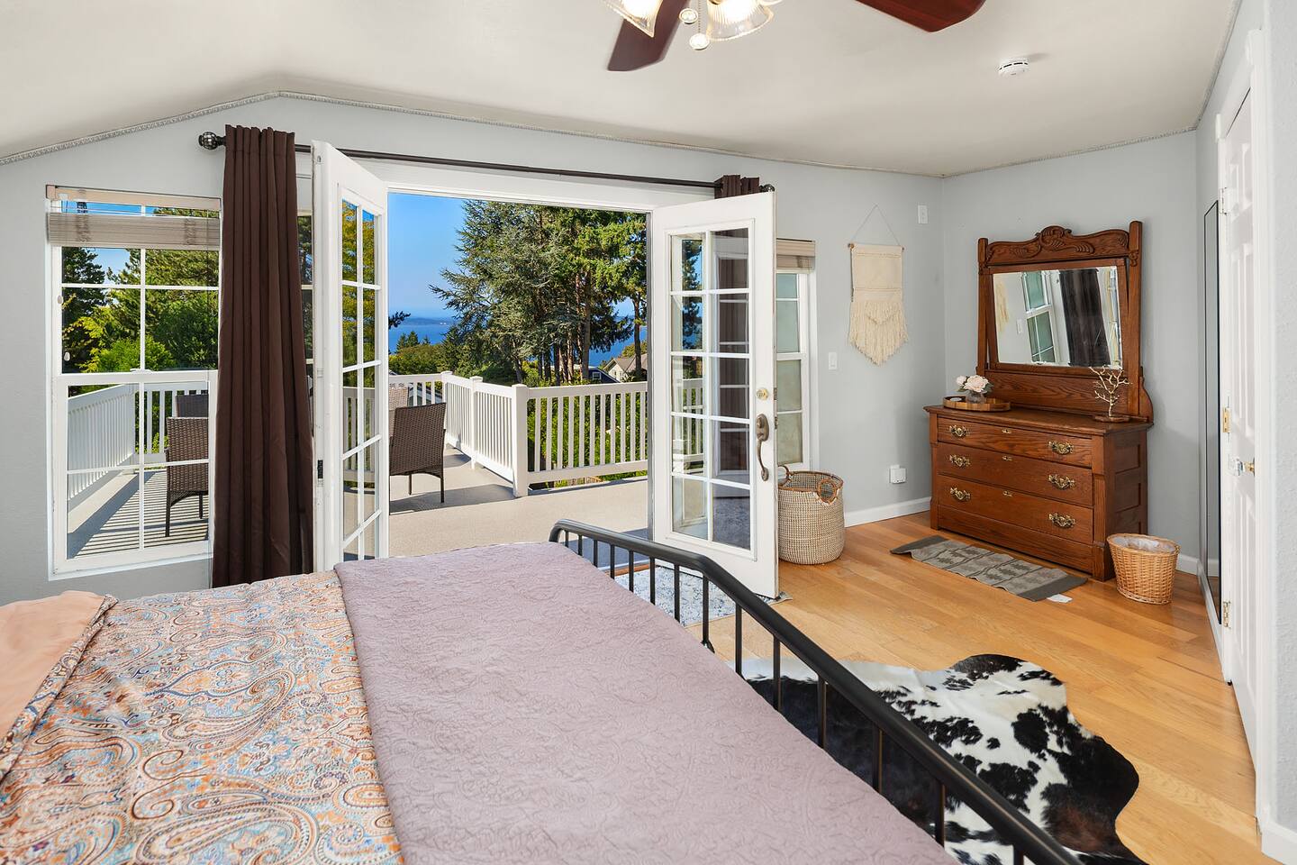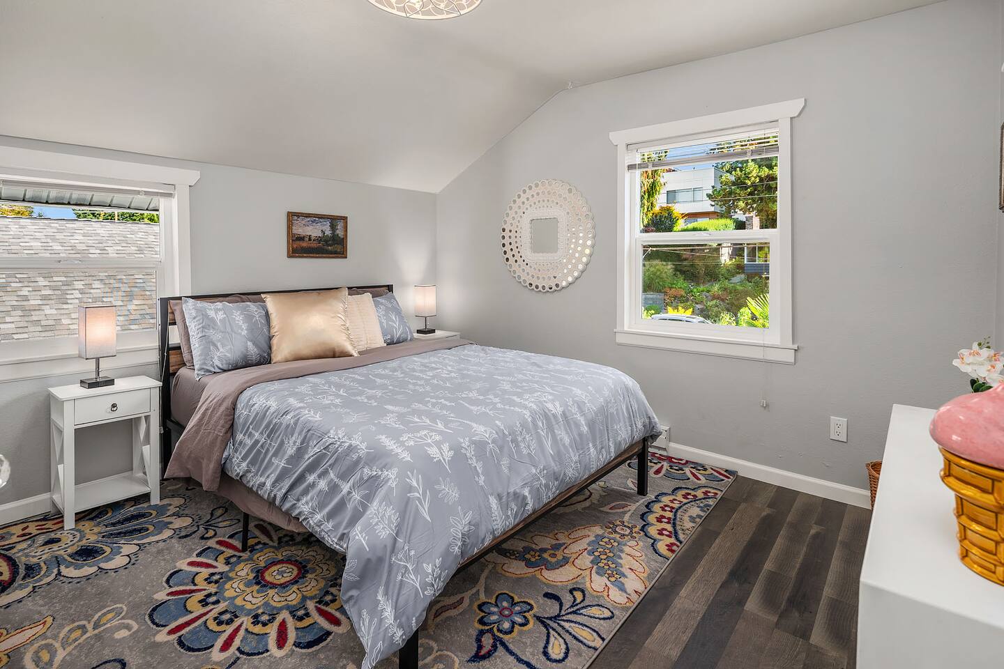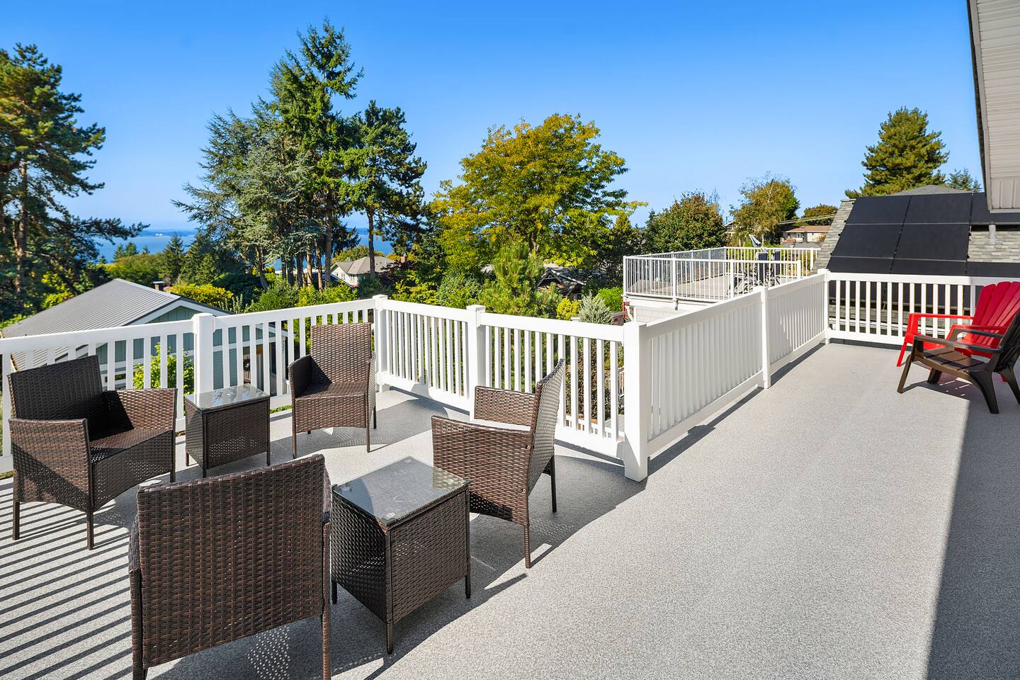 Find peace and quiet at our spacious, sun-filled home in West Seattle! Private and residentially located but walkable to cafes, parks & restaurants, you are close to California Ave and have easy access to downtown West Seattle and the Fauntleroy Ferry. Perfect for families or a group of friends, you have a large front porch and yard, spacious living room, chef's kitchen, dedicated workspaces, private decks with gorgeous views, flex room (sunroom that converts to 4th bedroom), and driveway parking. We hope you love our charming Craftsman! Featured Amenities: - Quiet, safe, and private residential neighborhood - Fast WiFi - 3 min to Thriftway, 4 min to Lincoln Park, 6 min to Westwood Village - 2 decks with gorgeous view of mountains over the Puget Sound - 3 bedrooms + 1 flex room (bedroom/sunroom) - Chef's kitchen - Free parking (driveway; also free street parking) - 4 TVs in the home DECKS: - Two expansive decks overlooking a gorgeous view of the Olympic Mountains over the Puget Sound - Main Floor Deck: Access through doors in flex room and in laundry area by kitchen - Top Floor Deck: Access through doors in master bedroom - Adirondack chairs and conversation sets for seating— chat, entertain, or eat while watching the sunset KITCHEN: - 4-burner electric range stove with built in griddle; Spacious oven + extra, smaller side oven - Ample counter space makes prep easy! - Dishwasher, Full sized fridge/freezer, Microwave - Trash compactor - Blender, 4-slice Toaster, Rice cooker, 2-Basket XL Air Fryer - Drip Coffee, Keurig, French Press, Burr Mill Coffee Grinder (coffee/beans provided), Tea, Sugar, Creamer - Ceiling-mounted pot rack - Fully stocked, all cookware and dishware - Cooking necessities (oil, salt, pepper; miscellaneous herbs, spices, sauces and seasonings) - Next to laundry area and main floor deck DINING ROOM: - Antique dining table, seating for 4 - Antique drop-down secretary/writing desk - Sit-stand desk with chair LIVING ROOM: - Plenty of seating: White & black leather couch and love seat, white leather reclining armchairs, ottoman poufs - Large smart TV with streaming apps - Spacious room with soaring ceilings - French doors (with blackout curtains) open to generous front porch— perfect for morning coffee or entertaining SUNROOM / 4TH BEDROOM (Flex Room): - Lounge, get work done, or have a sunny bedroom all to yourself! - Filled to the brim with natural light, with plenty of windows - Connected to the main floor deck— enjoy the gorgeous view! - Portable air conditioning - Wall-mounted smart TV with streaming apps As a sunroom/office: - Enjoy plenty of seating to chat, munch, or lounge around - Large bench with coffee table, small table/desk area, 2 plush lounge chairs As a bedroom: - The double doors to the dining room lock and have blinds you can bring down for privacy. - You have your own door to the deck and to the bathroom— lock the deck & bathroom doors that connect to the kitchen, and it's all yours! - Plush lounge chairs unfold to comfy futon-style beds— laid together forms a Queen, or keep separate for two Twins. MASTER BEDROOM: - King sized bed— and the room is still spacious! - Premium mattress (Helix) and bedding - Direct access to top floor deck— only doors are in this room. Entertain with the gorgeous view, or keep it all to yourself! - Filled with natural light. - Walk-in closet with hangers, drawers, and plenty of space. - Heirloom dresser with vanity - Large wall-mounted Smart TV with streaming apps - Full-body mirror BEDROOM 2: - Queen sized bed - Premium mattress + bedding - Window AC - Closet + dressers - Wall-mounted Smart TV with streaming apps - Full-body mirror BEDROOM 3: - Queen sized bed - Premium mattress + bedding - Closet - Small seating area - Vanity + mirror BATHROOMS: Main floor bathroom: - Shower/tub combo - Bidet (toilet with attachment) - Premium linens - Lockable doors to flex room, kitchen/laundry - Fully stocked with shampoo, conditioner, body wash, and toiletries Top floor bathroom: - Shower/tub with sliding glass door, window to outdoor view from deck - Detachable shower head attachment - Spacious room with double vanity, counter space, and lots of room for linens and storage - Premium linens - Fully stocked with shampoo, conditioner, body wash, and toiletries